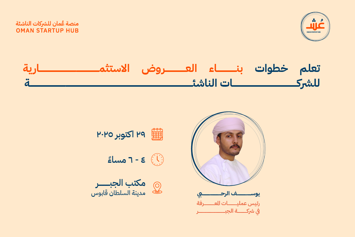 إنضم إلينا في ورشة العمل: "تعلم خطوات بناء العروض الاستثمارية للشركات الناشئة" واكتسب المهارات التي تساعدك على جذب المستثمرين وتحقيق النمو