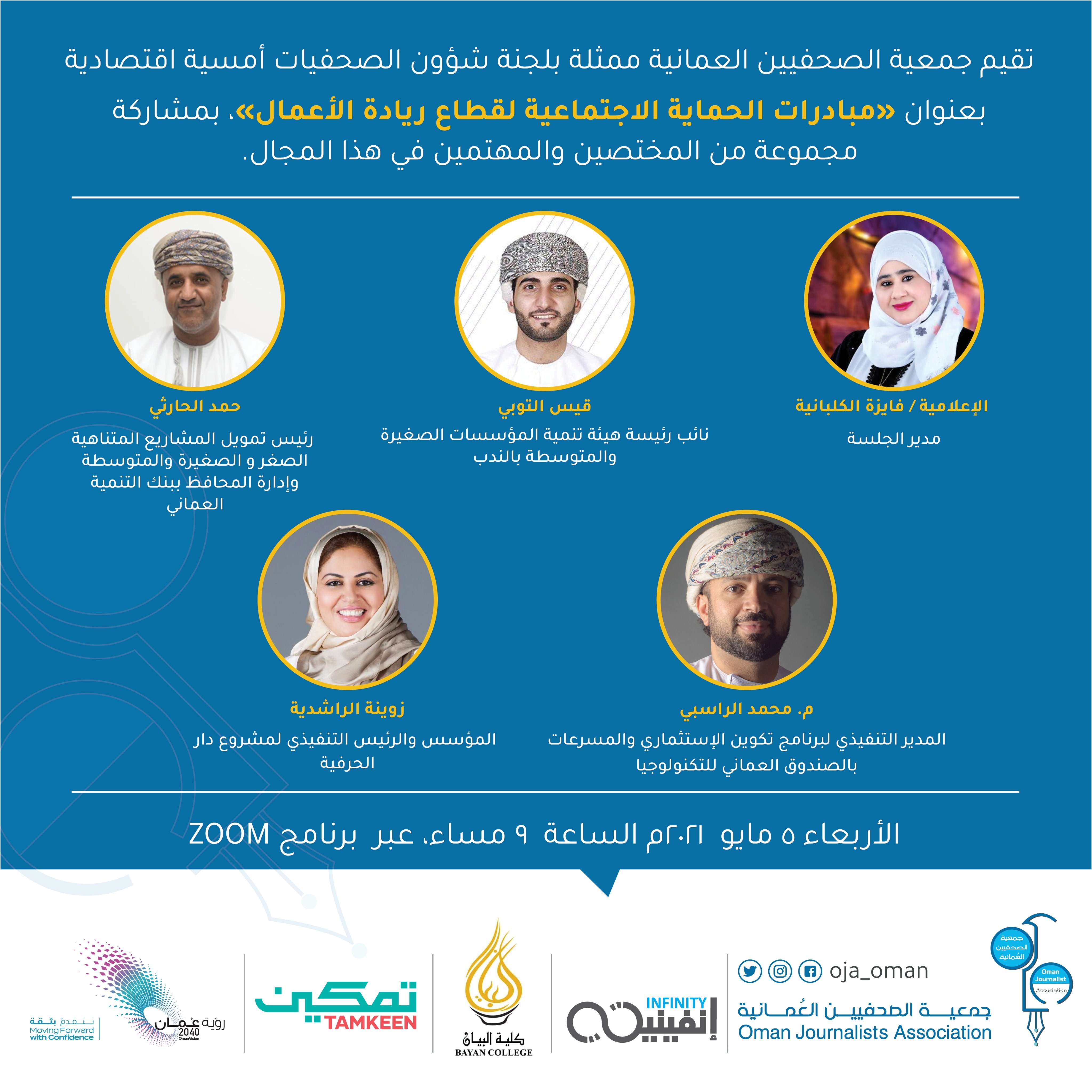 The Omani Journalists Association, represented by the Women Journalists' Affairs Committee, is organizing an economic evening entitled "Social Protection Initiatives for the Entrepreneurial Sector", with the participation of a group of specialists in this field